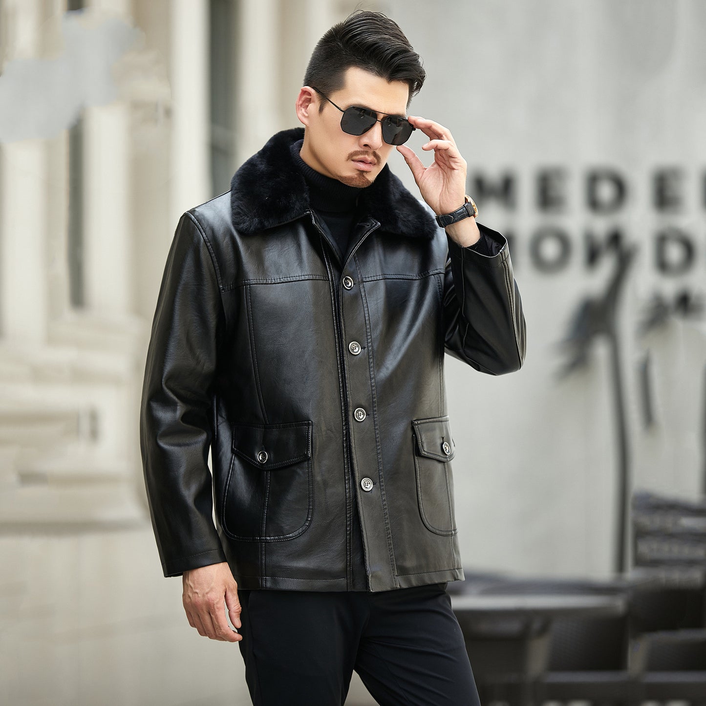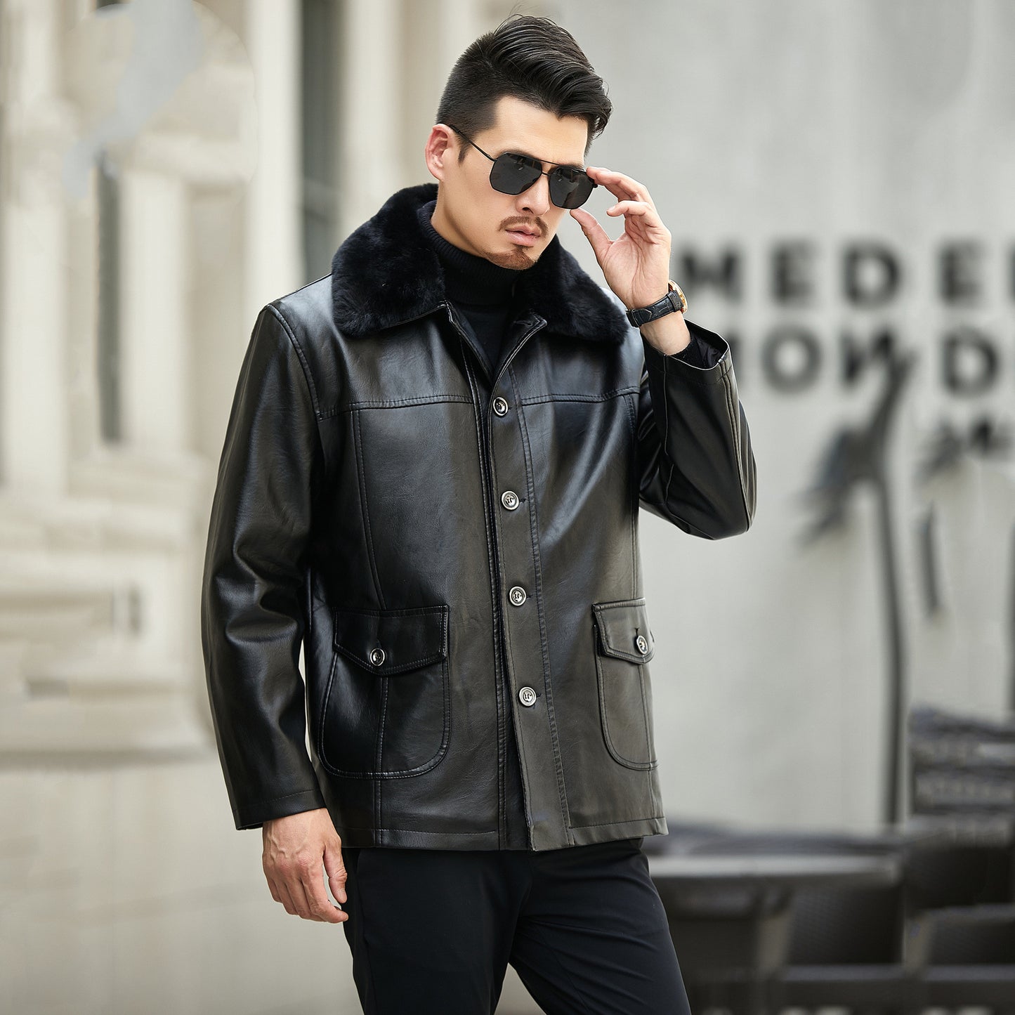 Middle-Aged And Elderly Men's PU Leather Buttoned Large Fur Colla