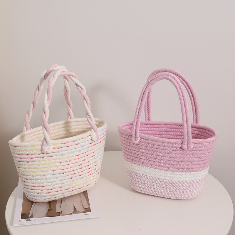 Pink Twist Portable Cotton Thread Woven Bag New Small Fresh Hand Carry Ladies Bag Holiday Beach Bag Picnic Basket